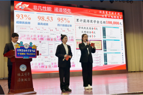 数据201班创造性地以产品发布会的形式展示了班级风采。他们以产品打造自喻,从层级架构、底色鲜红、超强性能、兼容能力四个方面介绍了打造过程。班级坚持“党团联动”,建设“七彩班级文化”,连续三年获校“五四红旗团支部”、“校先进班级”。10名同学光荣入党,25人获得奖学金,在数学建模、“互联网+”等学科竞赛中获国家级31项,省级47项。班级积极投身志愿服务,“移动实验室”科普志愿服务队走进10所学校,服务时长超3000小时,事迹先后被中国青年报、学习强国、马鞍山日报等媒体报道。