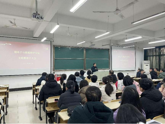 在数理楼403室召开全院教职工大会,学院全体教职工参加会议,会议由学院党委书记汪春胜主持。