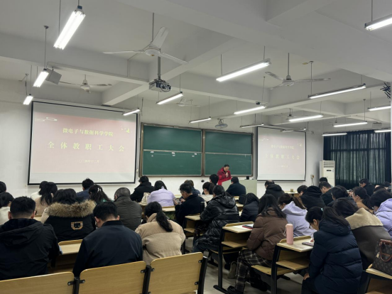 在数理楼403室召开全院教职工大会。会议由学院党委书记汪春胜主持,学院全体教职工参会。