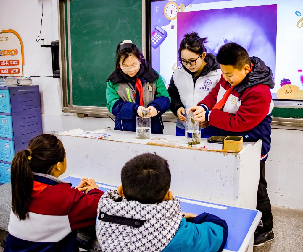 志愿者分两组同步开展教学。围绕 “神奇的大气压” 主题,志愿者结合生活实例引出科学问题,通过动画演示与动手实验相结合的方式,将抽象的科学原理转化为直观可感的教学内容,帮助学生轻松理解大气压的奥秘;在“会跳舞的豆子”主题课堂,志愿者引导学生通过实验观察豆子在不同液体中的运动状态,深入浅出地阐释了浮力与气体之间的关联知识。