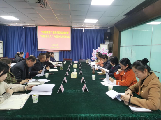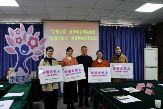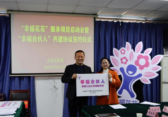 3月11日,花山区金家庄街道举行“幸福花花”服务项目启动仪式,共青团花山区委、韩漫 、花山区妇联、花山区人民检察院等首批“幸福合伙人”单位代表参与了启动仪式,就共建工作进行了深入交流,并现场签署共建协议。签约仪式上,学院研究生党支部支部书记宋二银老师就共建工作进行了深入交流。